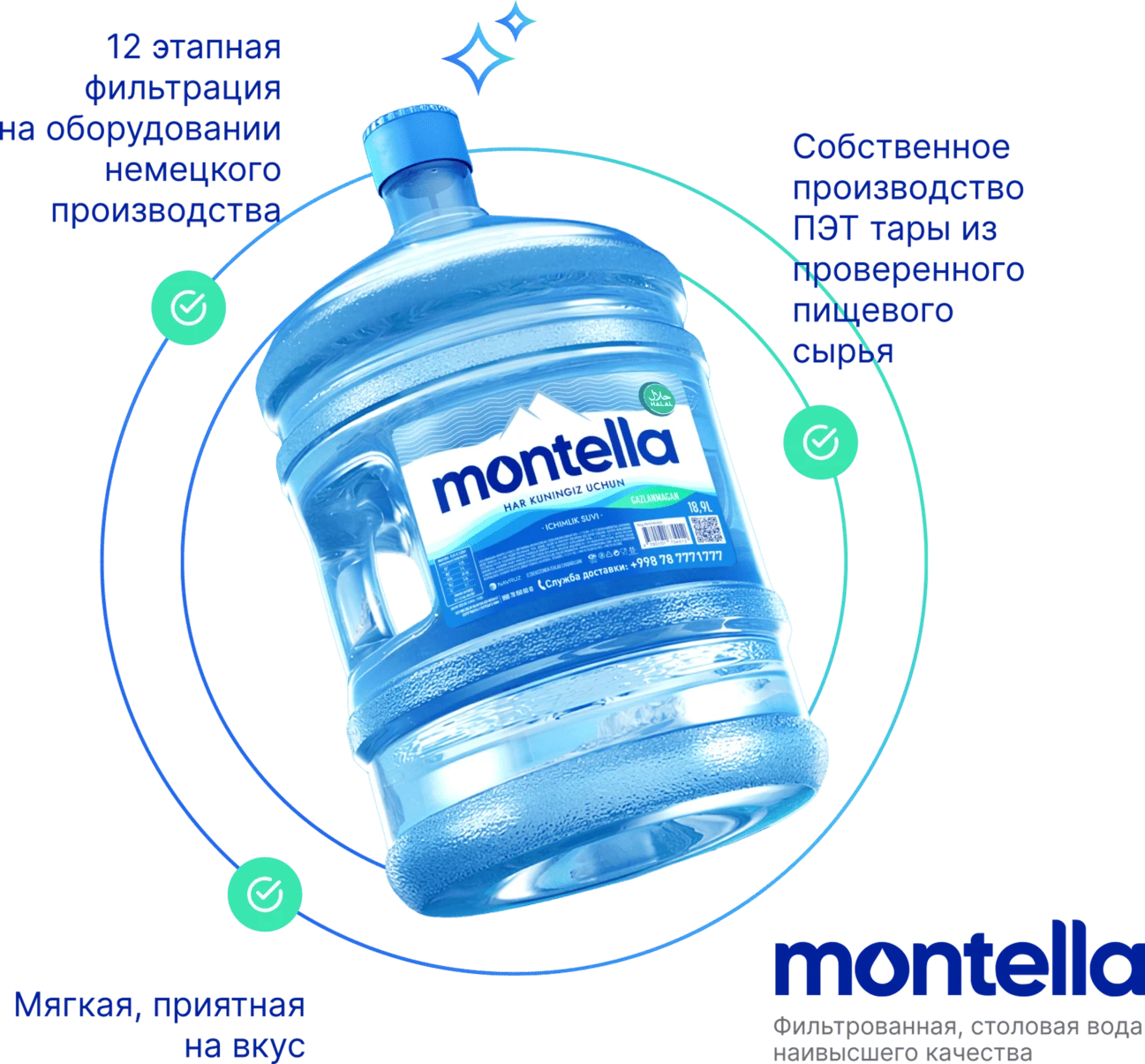 Вода Montella проходит через различные фильтры, такие как песчаные фильтры, угольные фильтры, свечные фильтры с 10 микронным и 5 микронным размером, фильтры осмоса, ультрафильтры, произведенные в Германии, чтобы соответствовать всем требованиям и стандартам качества, и подвергается озонированию. Она сохраняет свою полезность для организма человека. Montella имеет сертификат о соответствии Санитарно-эпидемиологической службы Республики. Она успешно прошла радиологические и бактериологические испытания, что делает ее полезной для здоровья человека.
